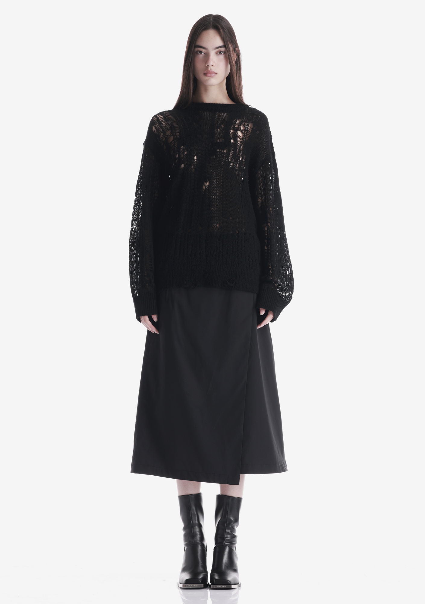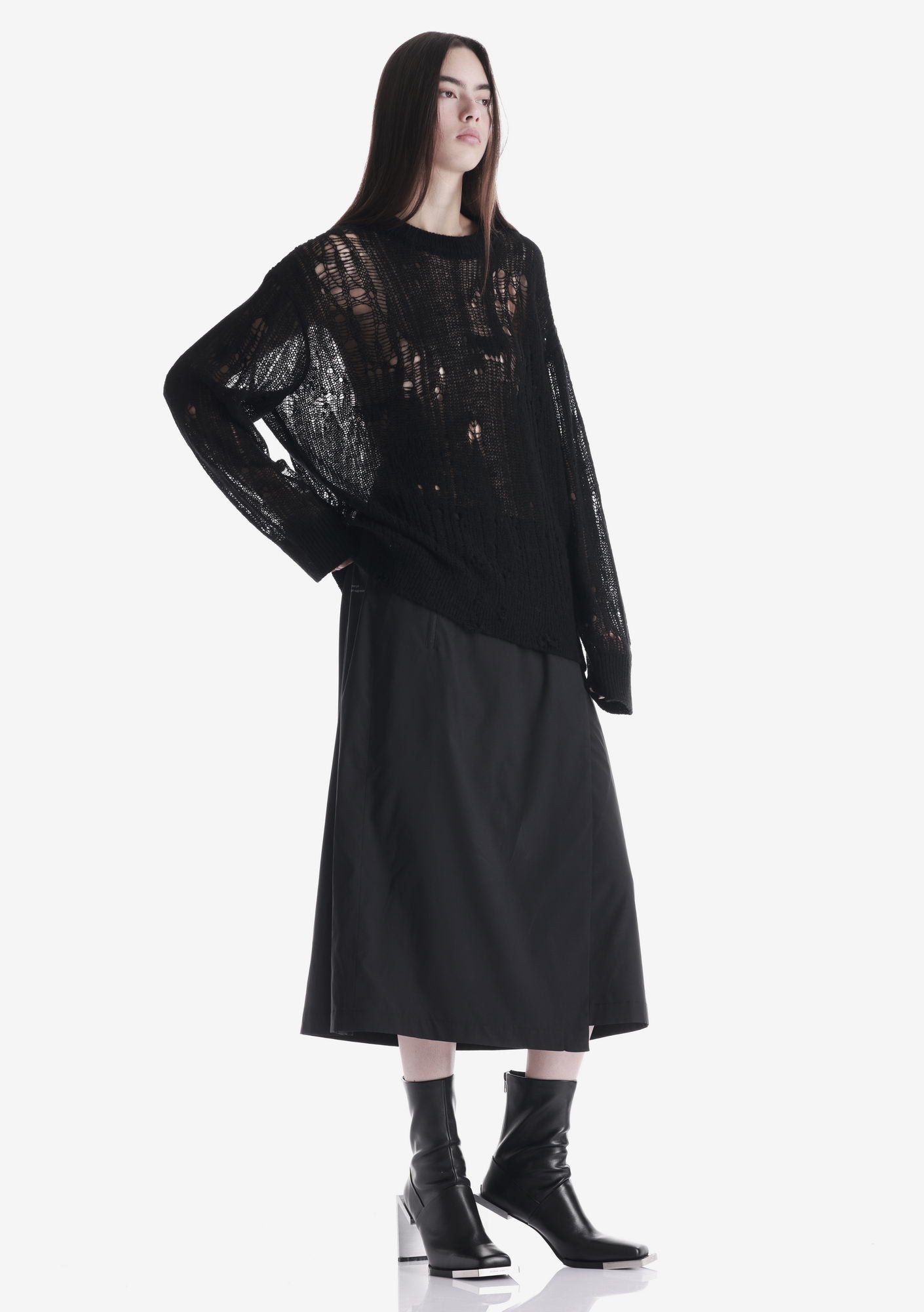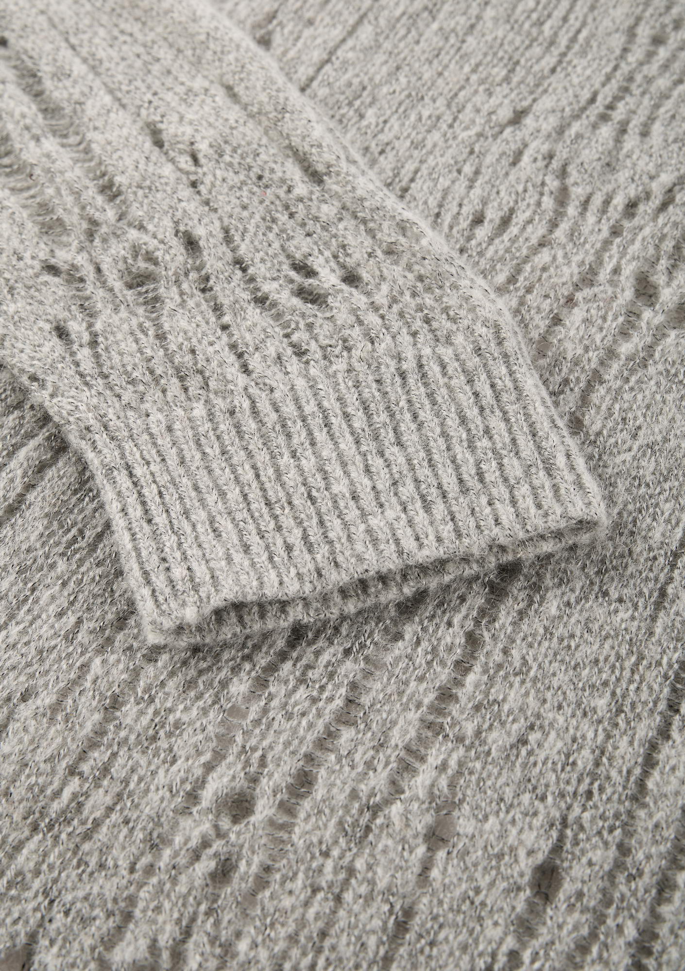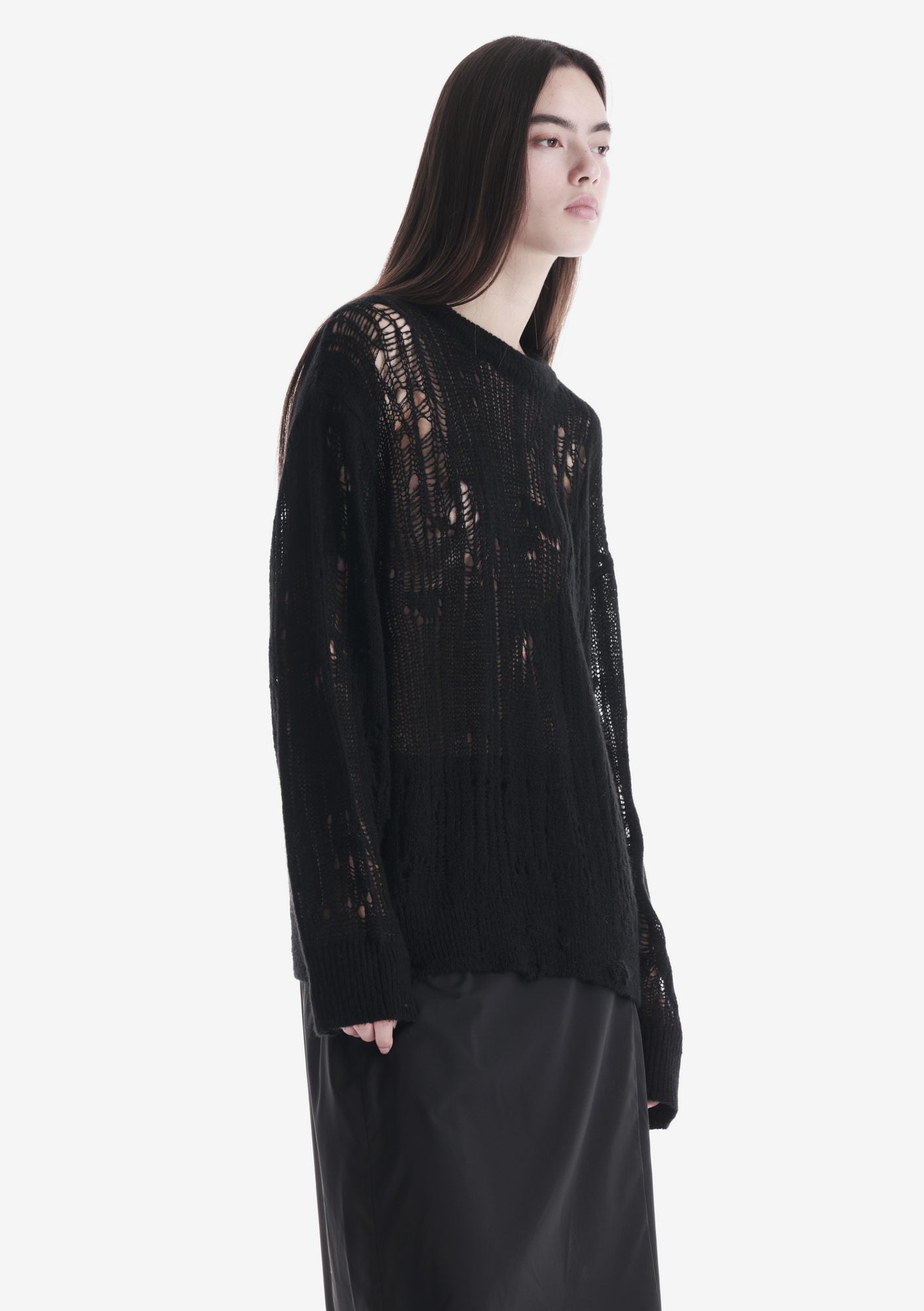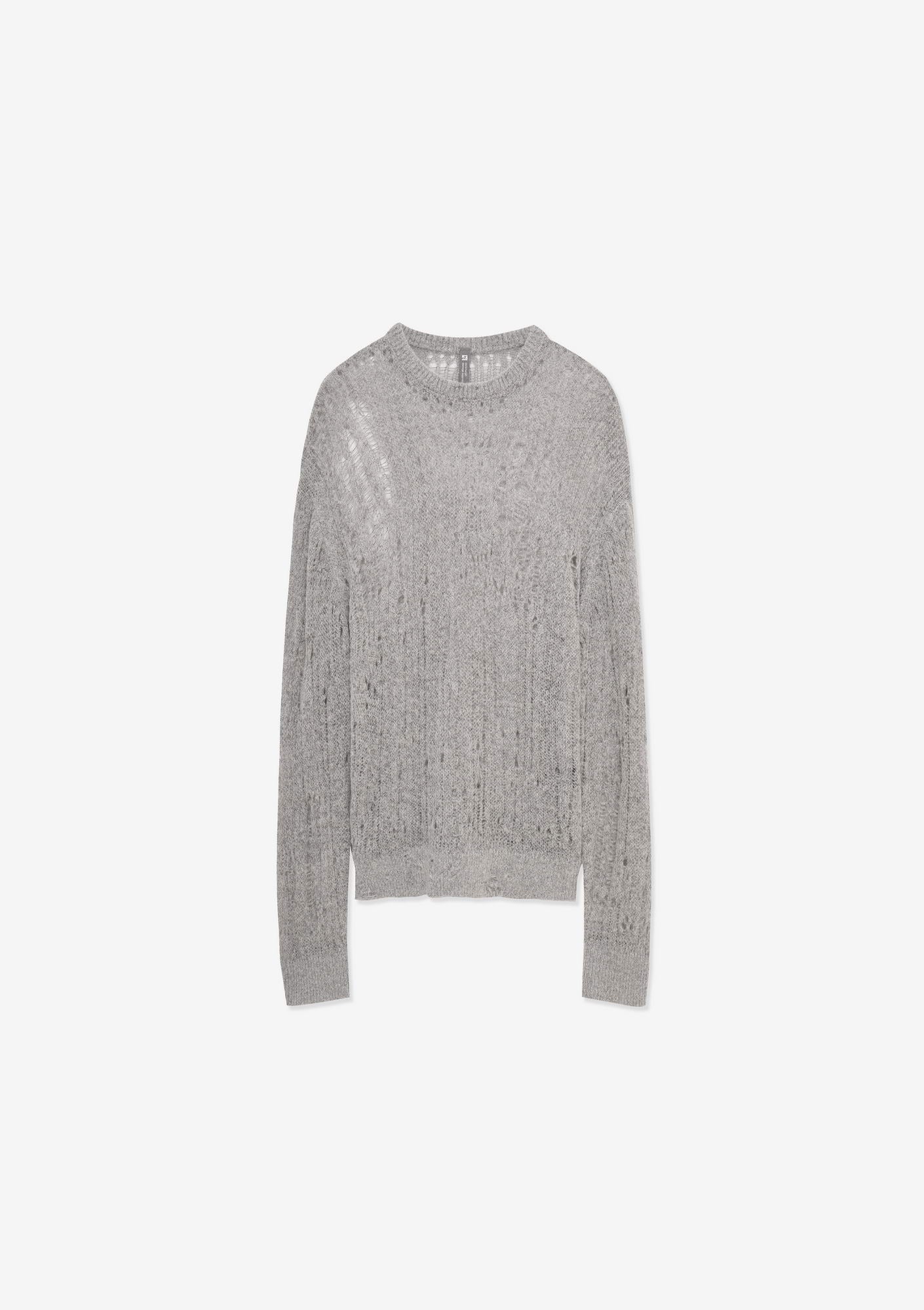WARP sweater with a crew neck and elongated sleeves is made in a fishnet knit that creates a lightweight, textured structure. The blended yarn of nylon, acrylic, wool, and mohair combines softness, warmth, and shape retention while maintaining durability and comfort.