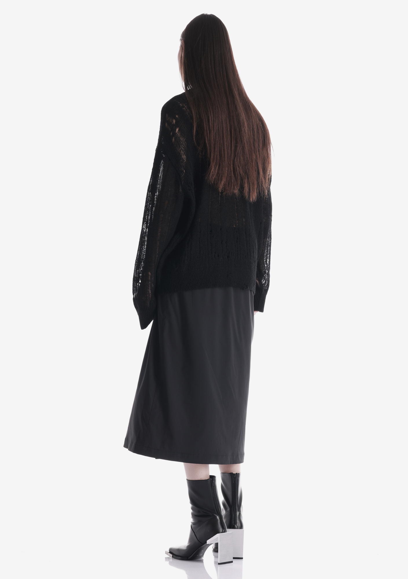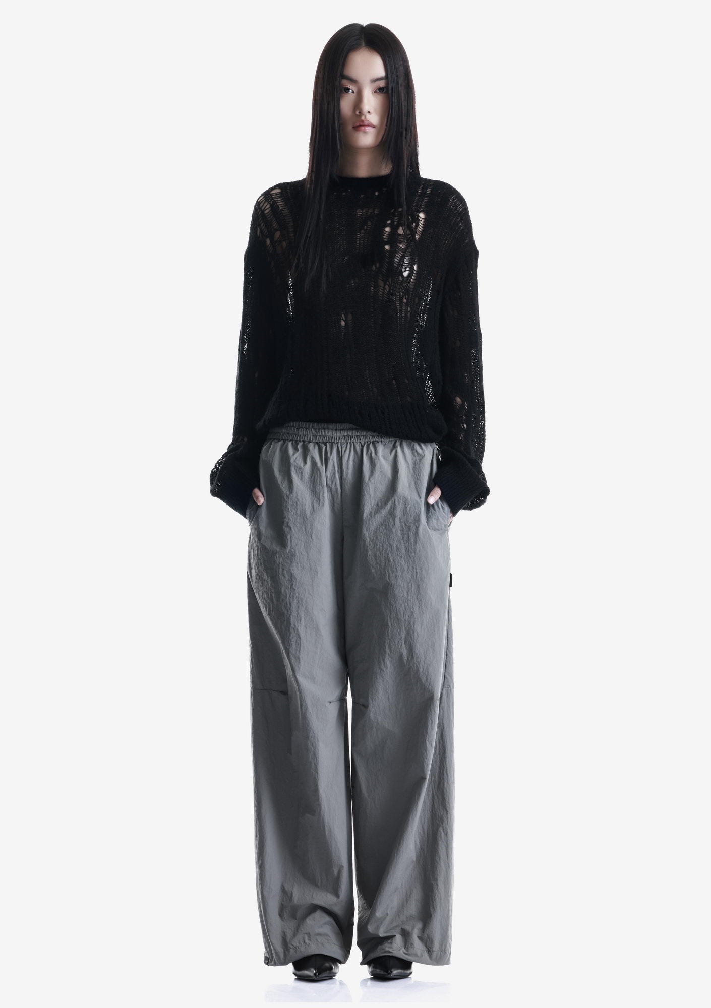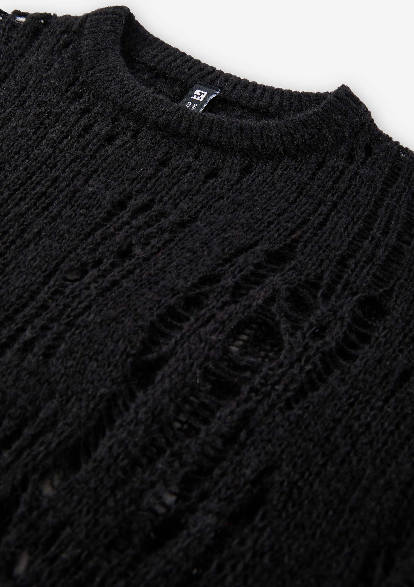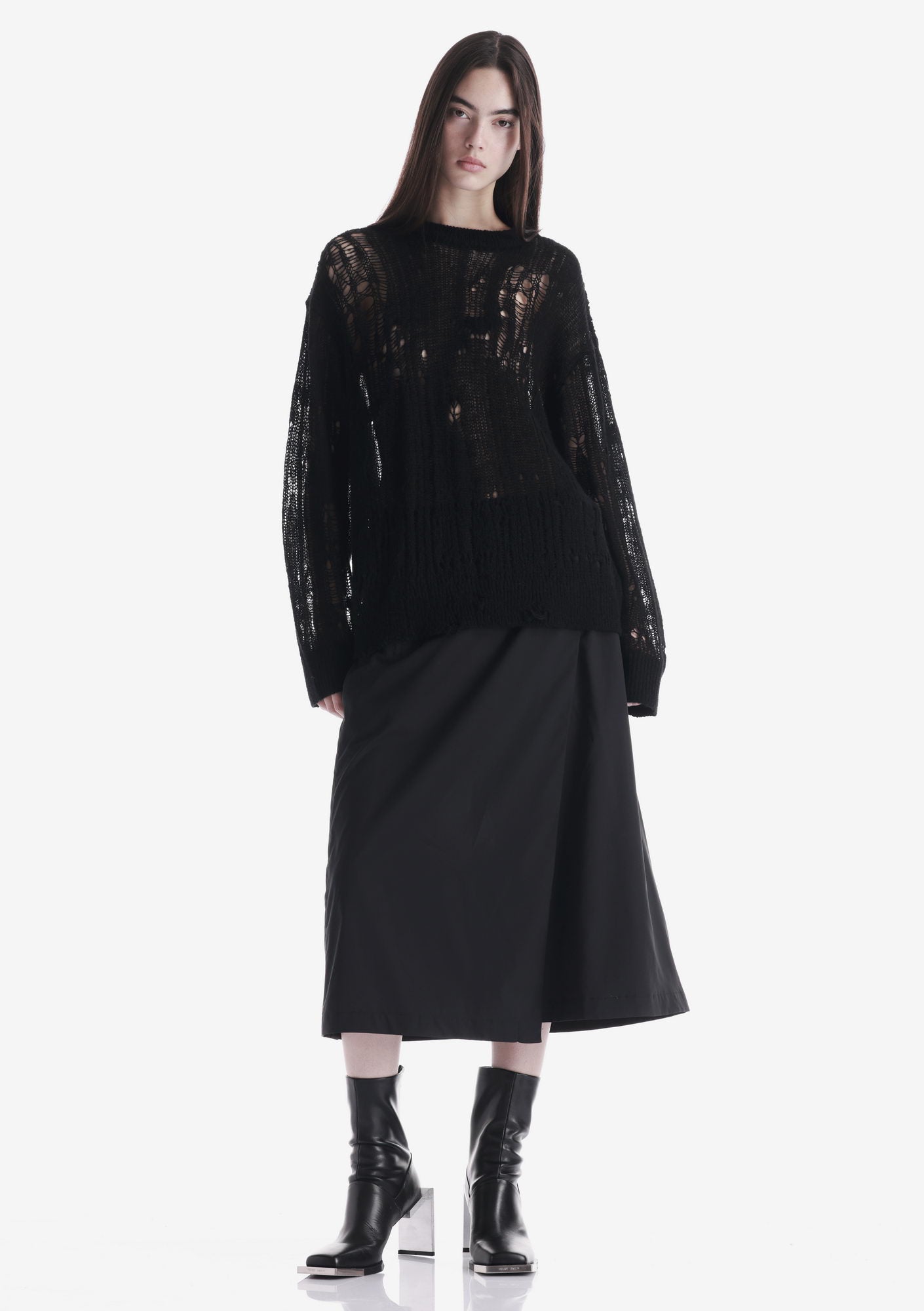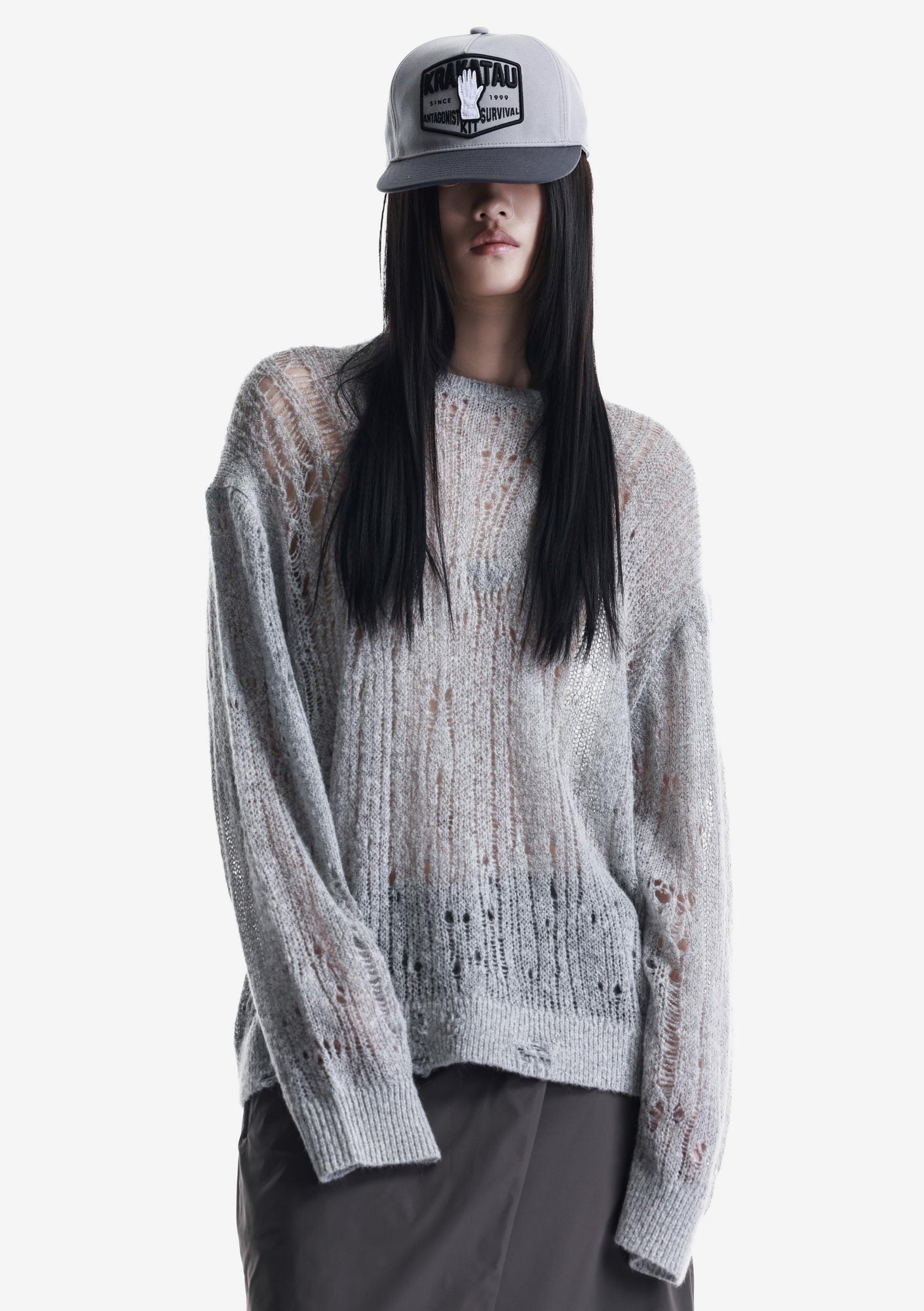 WARP sweater with a crew neck and elongated sleeves is made in a fishnet knit that creates a lightweight, textured structure. The blended yarn of nylon, acrylic, wool, and mohair combines softness, warmth, and shape retention while maintaining durability and comfort.