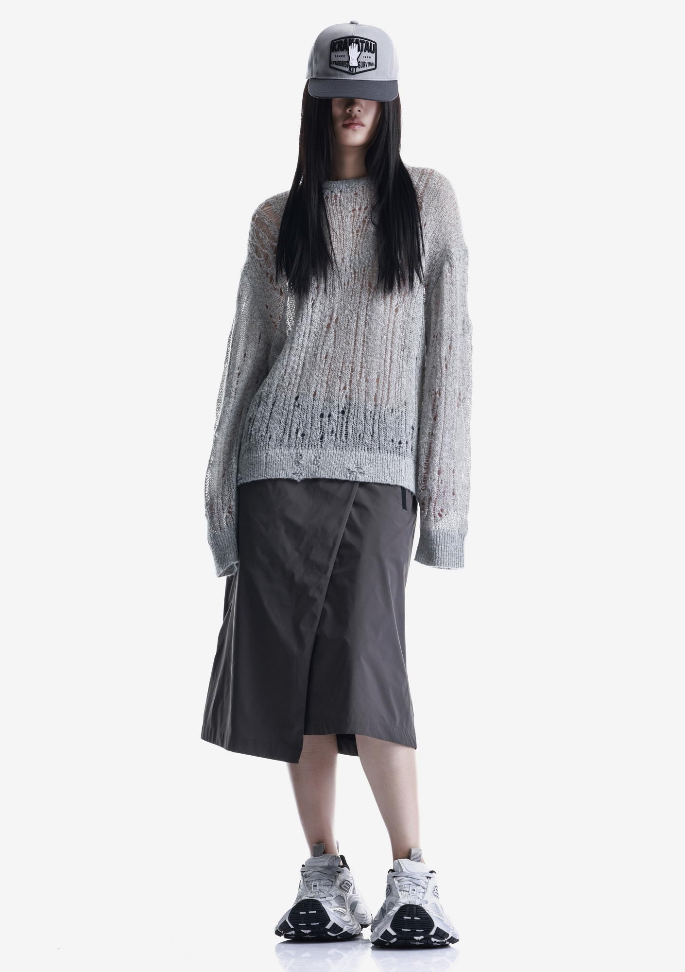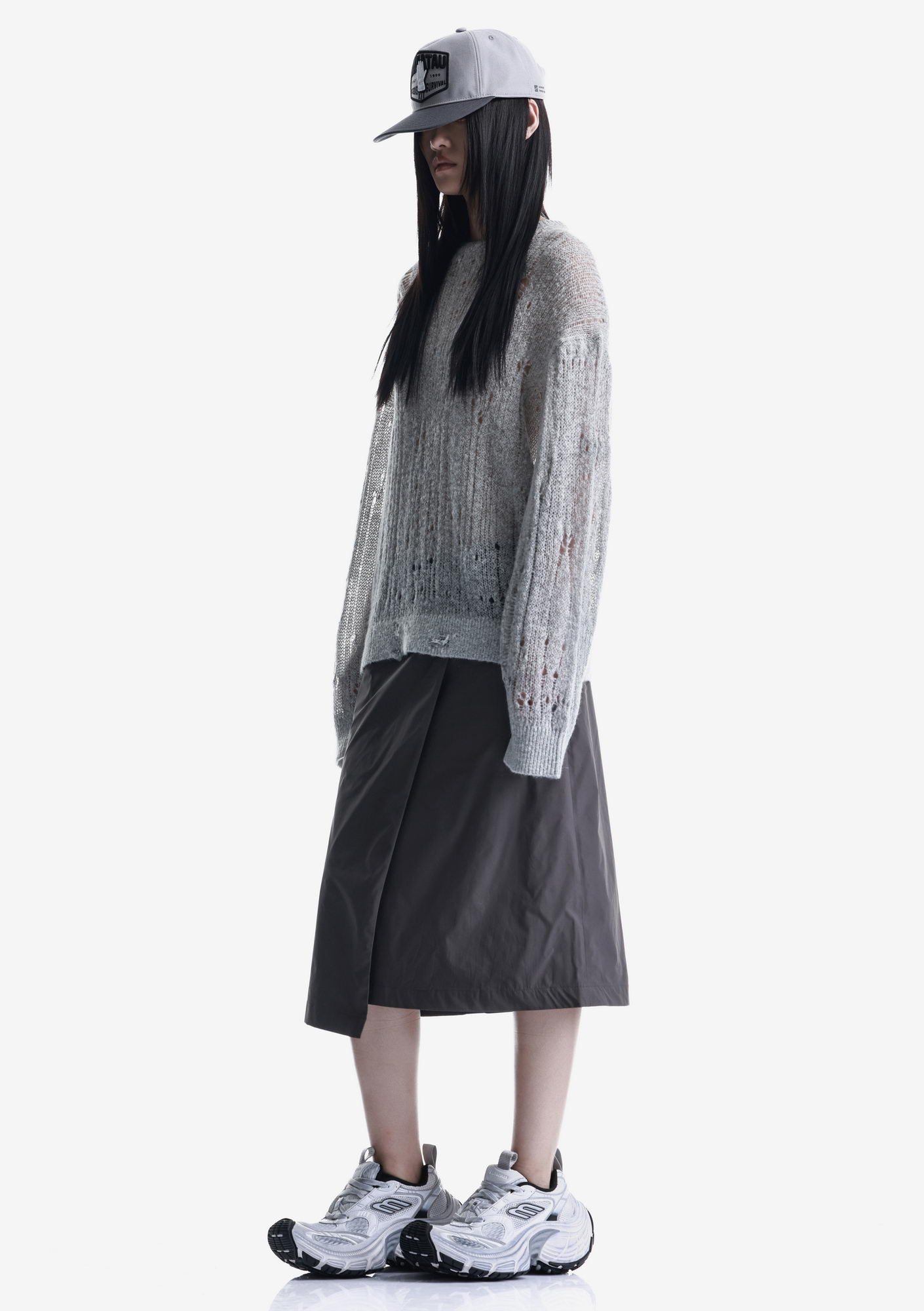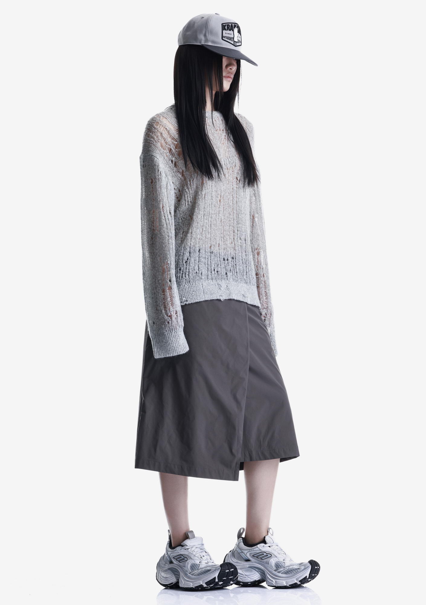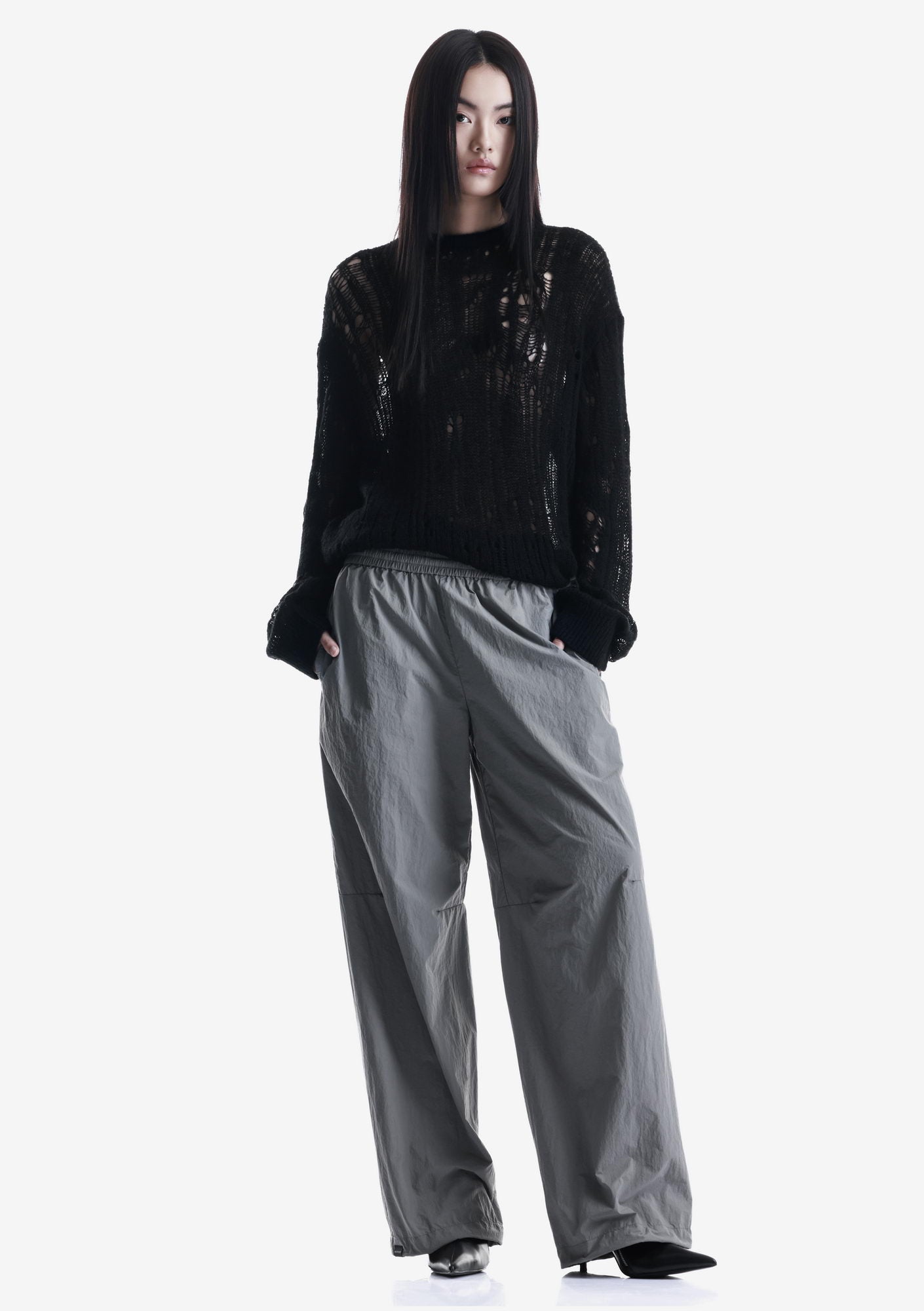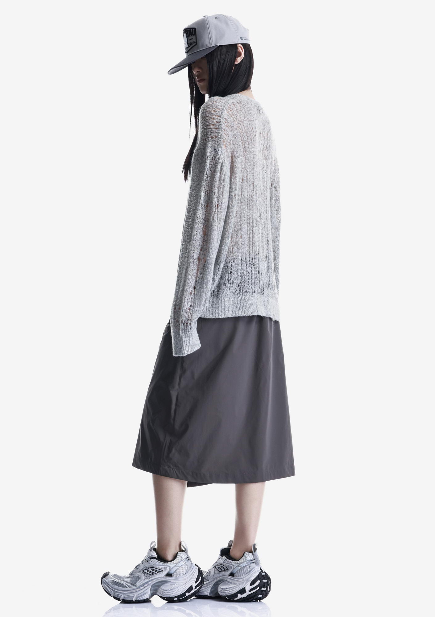 WARP sweater with a crew neck and elongated sleeves is made in a fishnet knit that creates a lightweight, textured structure. The blended yarn of nylon, acrylic, wool, and mohair combines softness, warmth, and shape retention while maintaining durability and comfort.