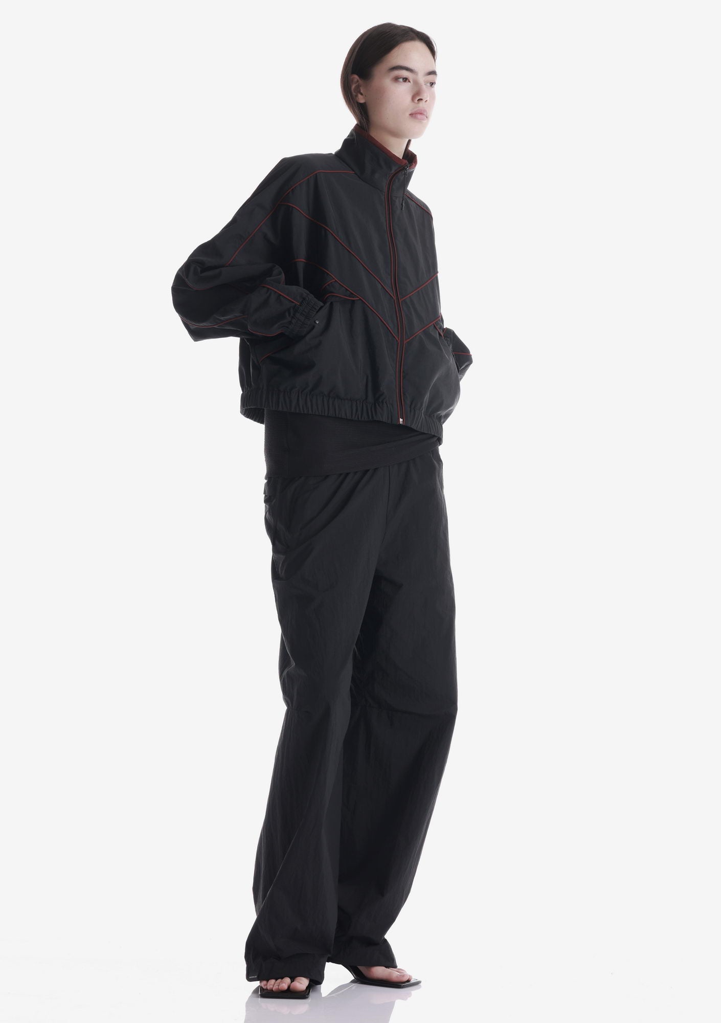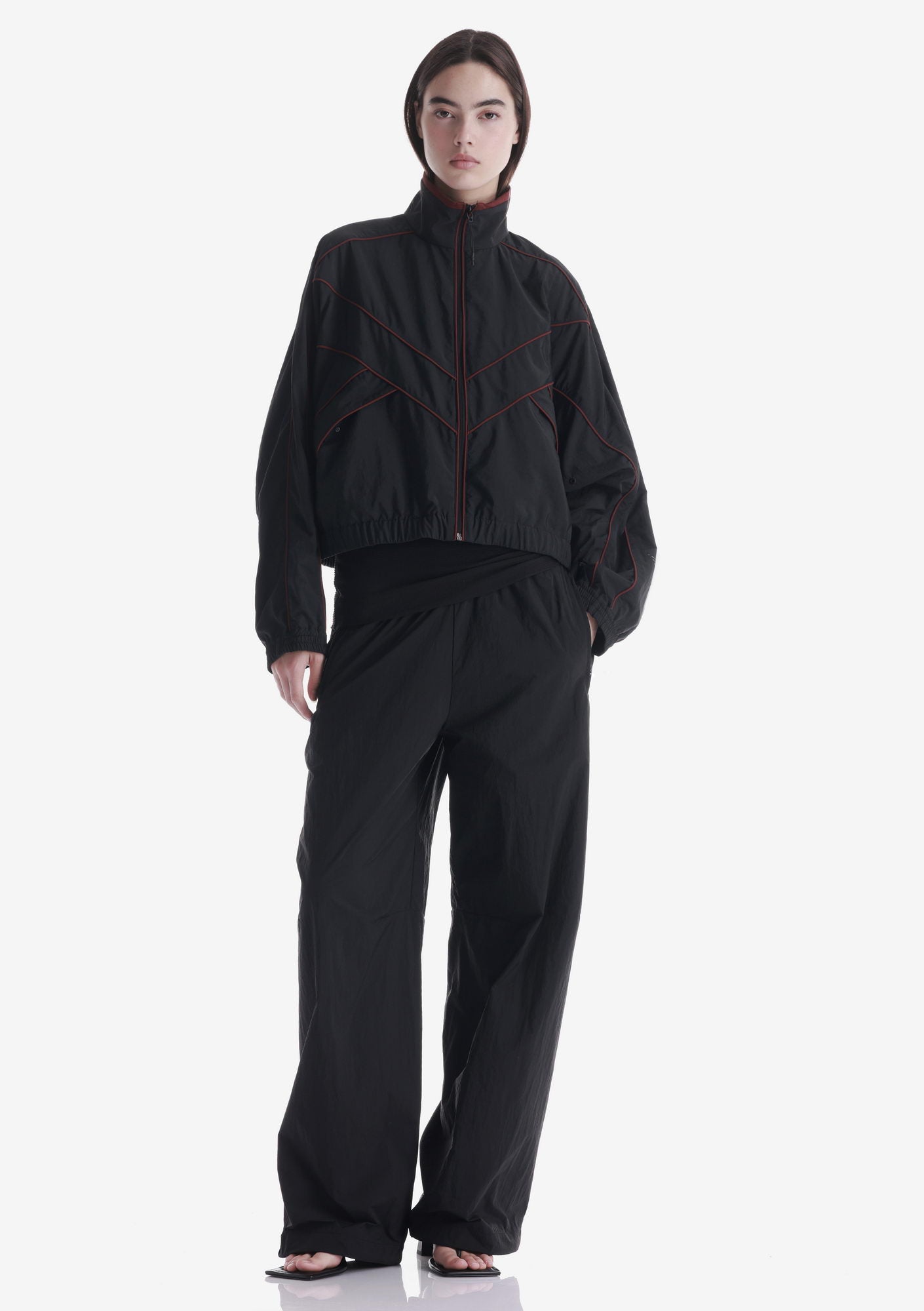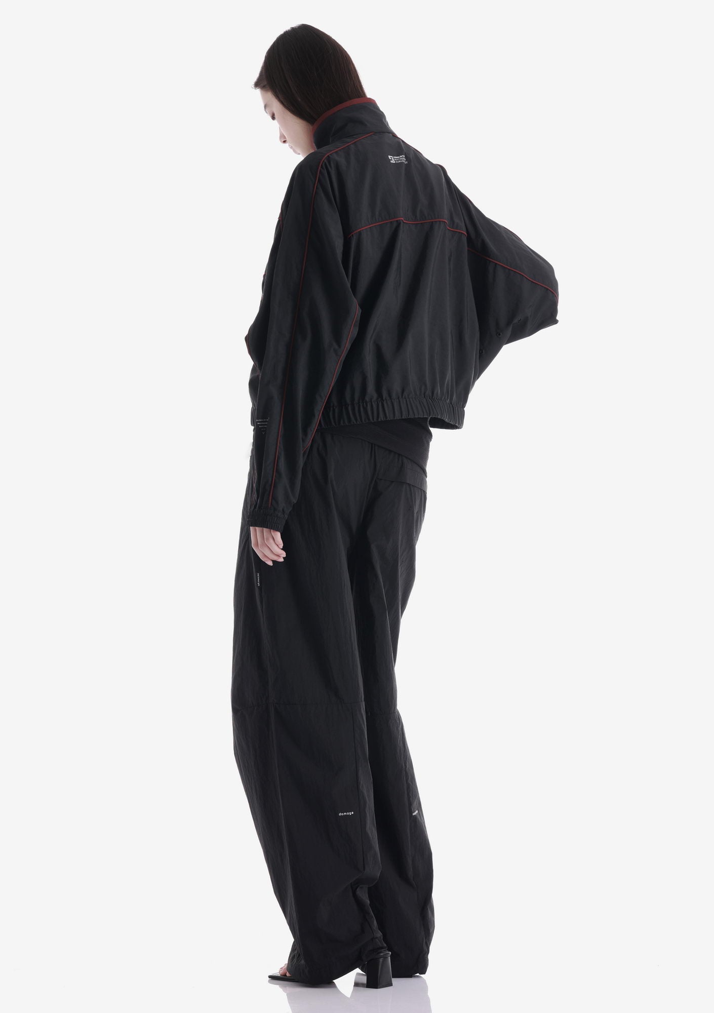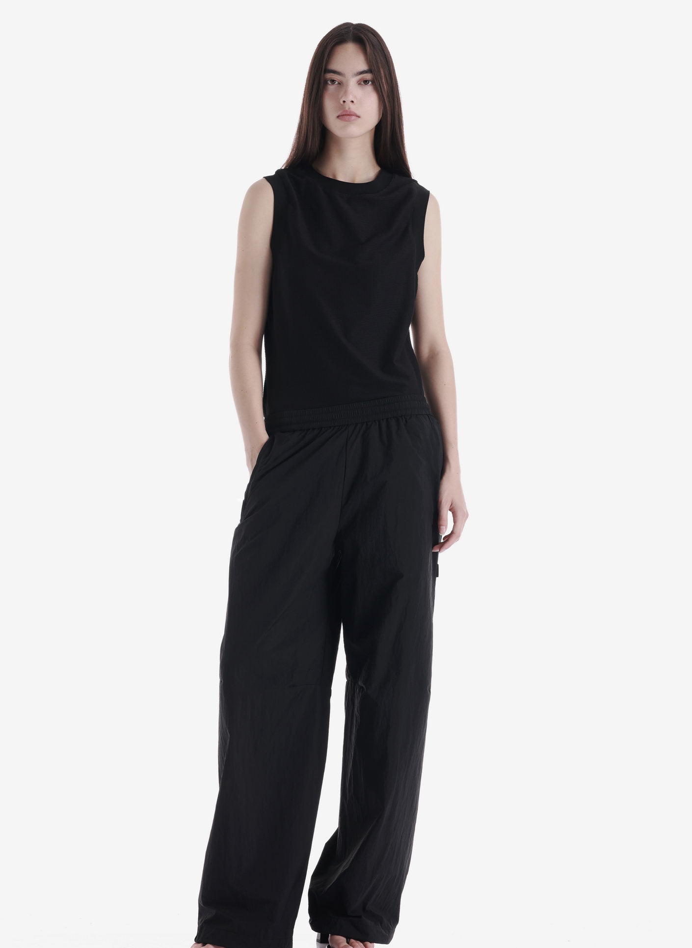 SEMERU relaxed-fit pants made from thin, almost weightless nylon with a slightly crinkled texture. The elastic waistband with drawcord ensures a comfortable fit, the adjustable hem allows the silhouette to be customized, and the rear zip pocket with RFID protection adds functional utility.