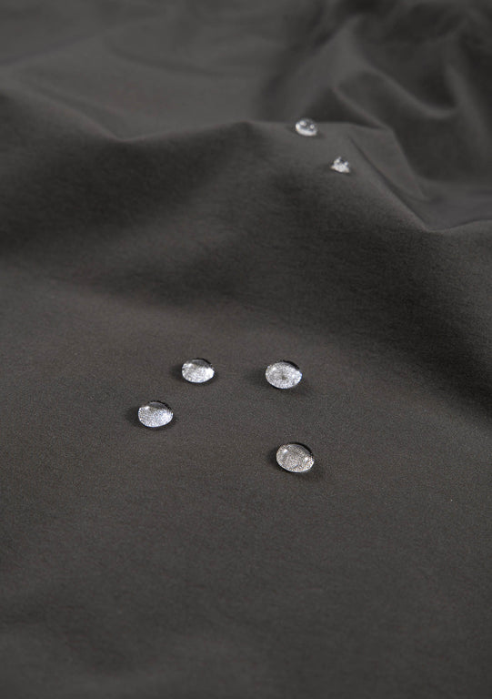 Functional nylon with a matte surface is resistant to abrasion and tearing. A TPU membrane coating and PFC-free water-repellent finish provide protection from precipitation. 100 % nylon.