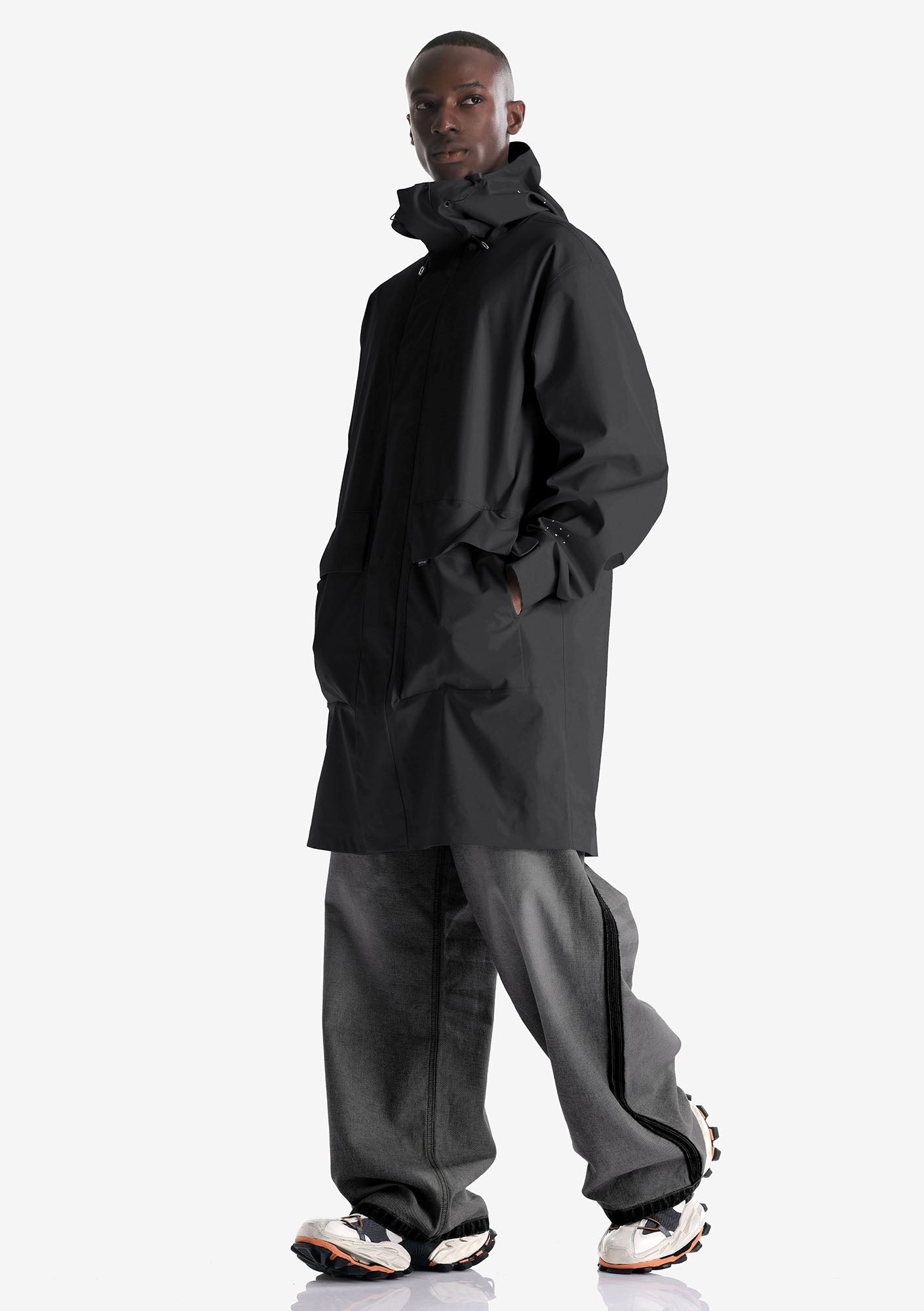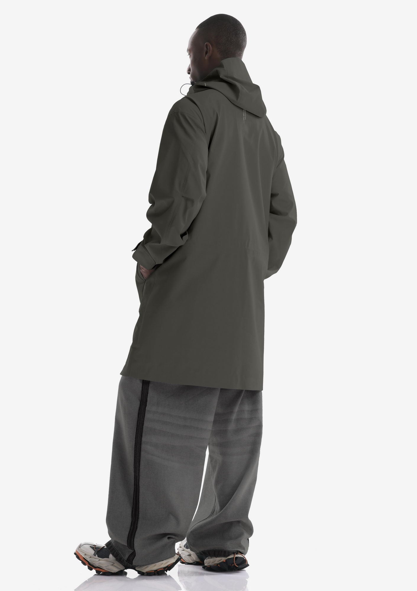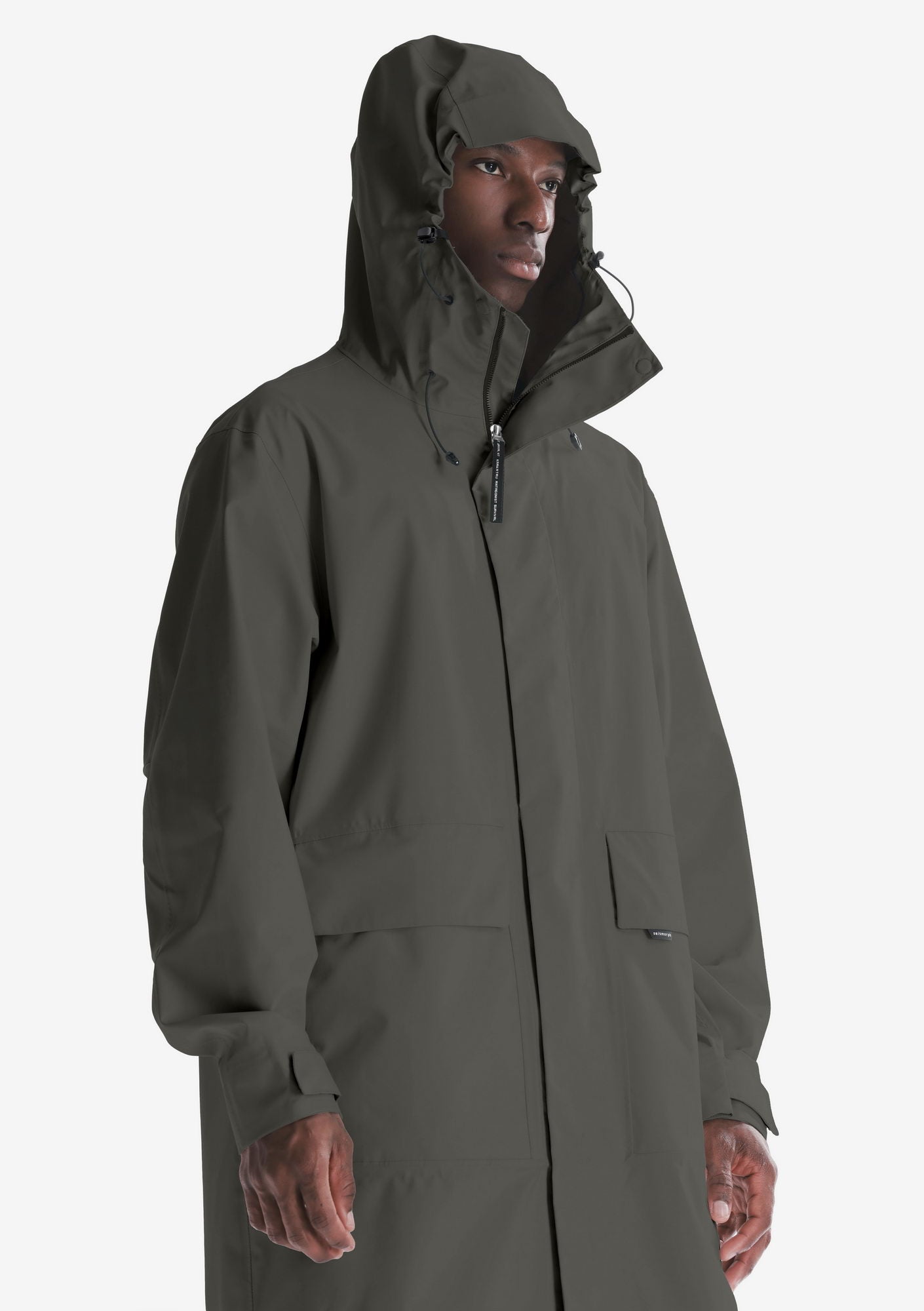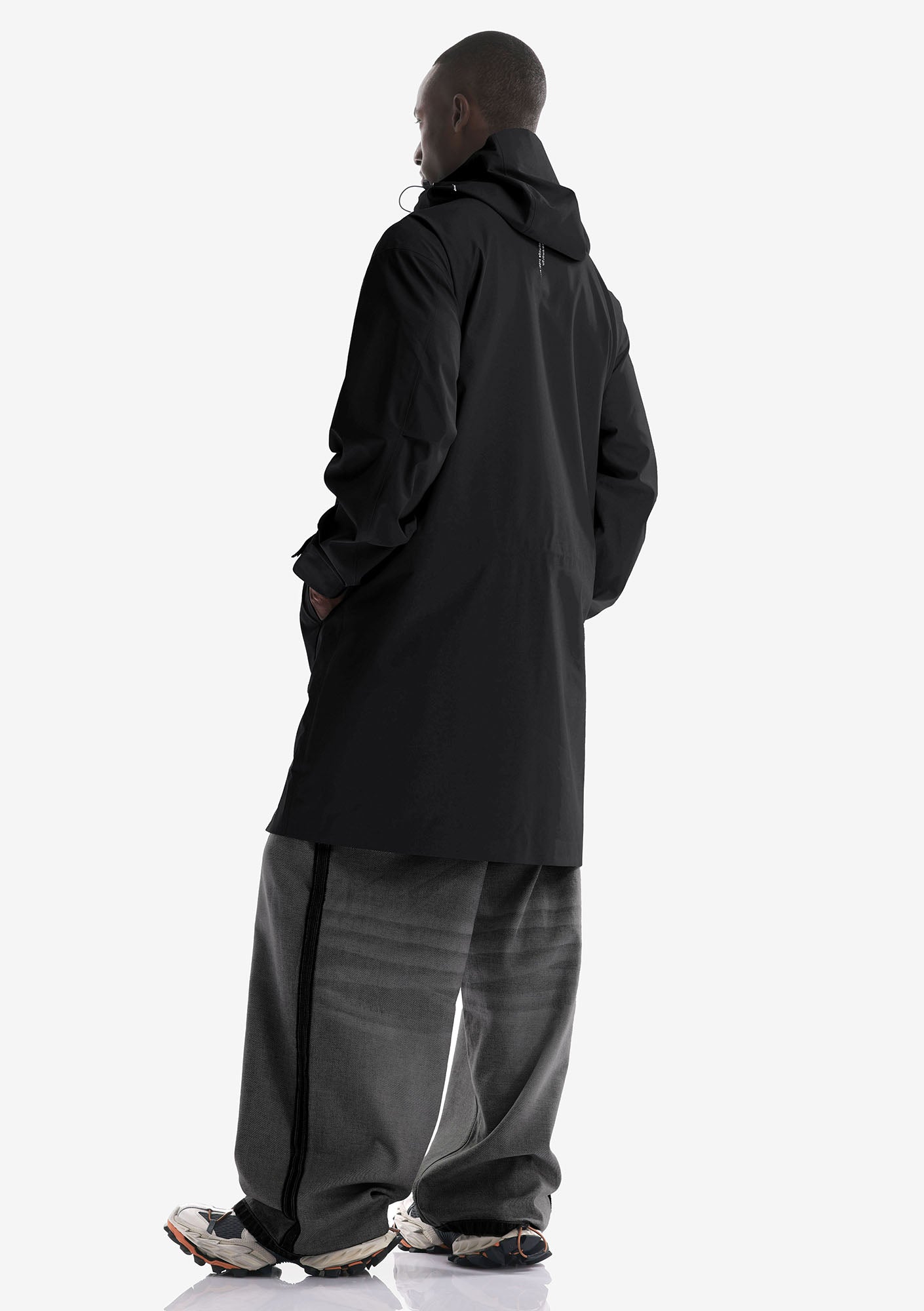 Technical raincoat SAGITTARIUS A features a modern relaxed fit and is made from functional water-resistant fabric with a cotton-like feel. The ergonomic hood and high collar provide protection from the elements. The windproof placket and magnetic pocket flaps fasten with a single effortless motion. Every detail of this raincoat is integrated into the form, enhancing its visual clarity.