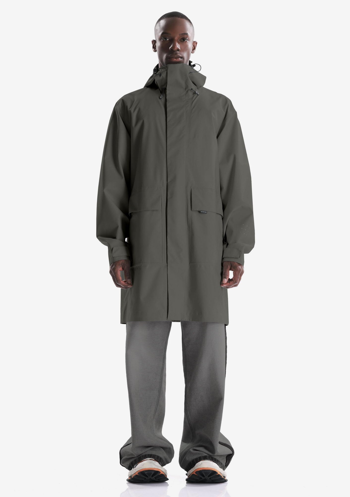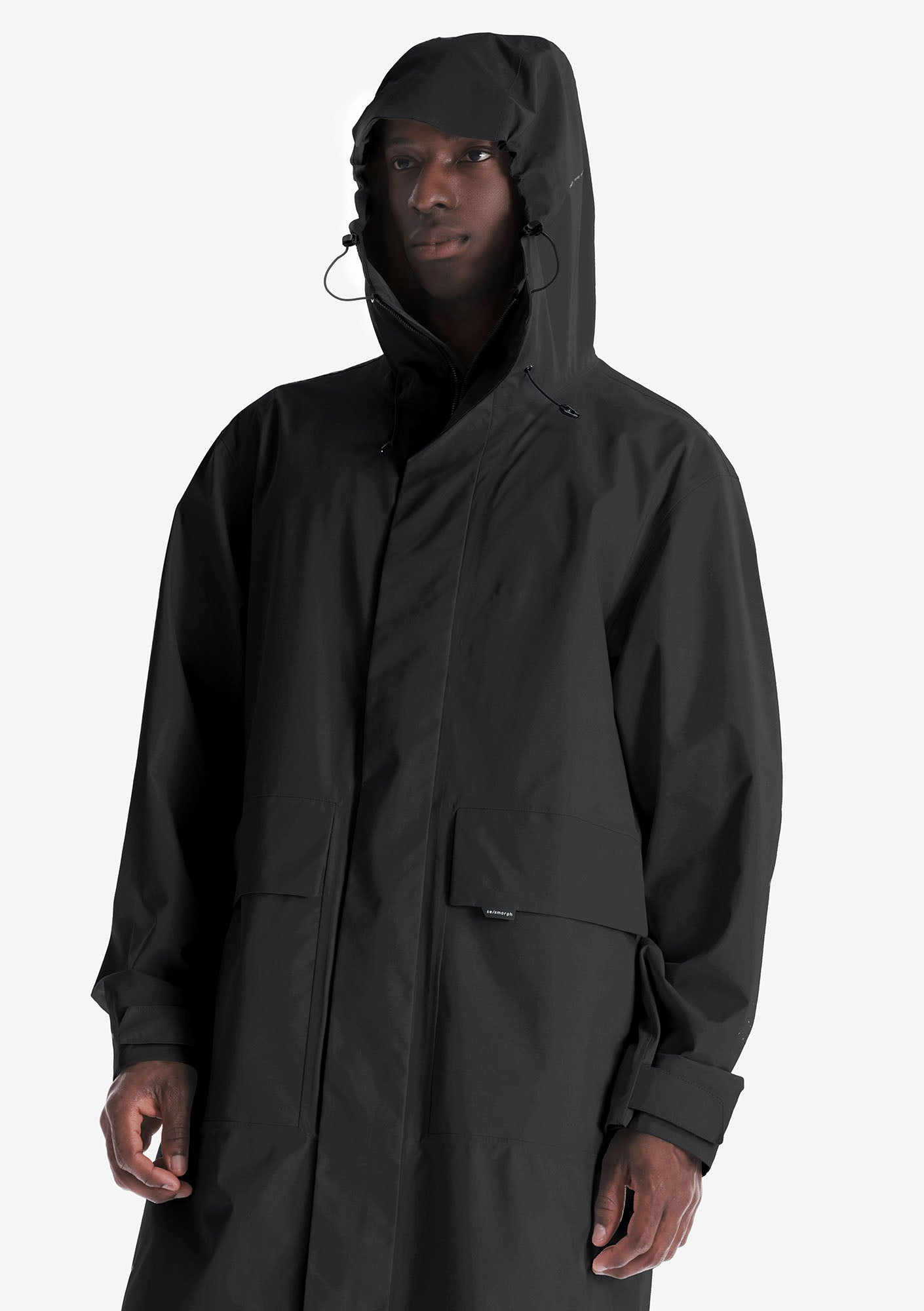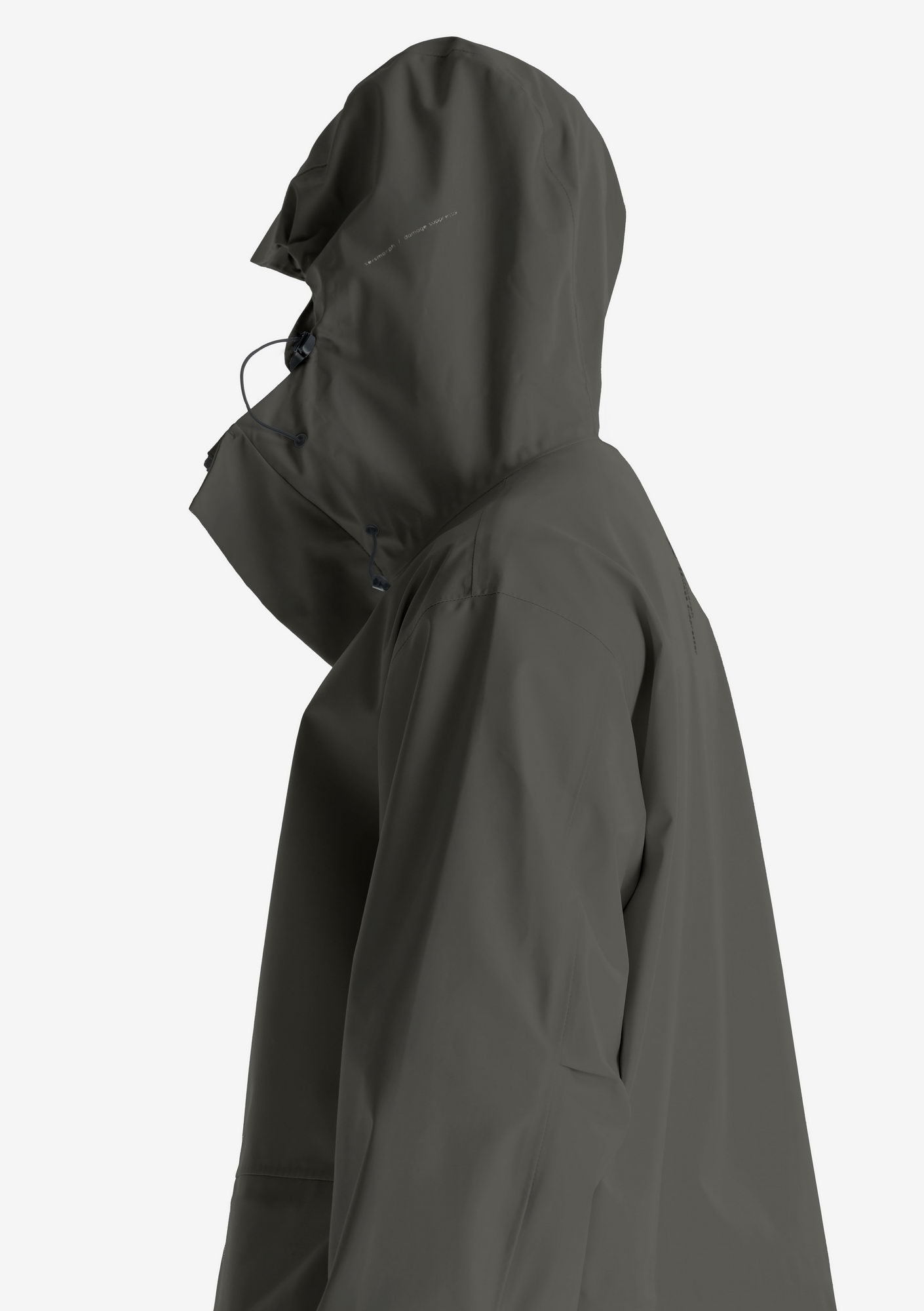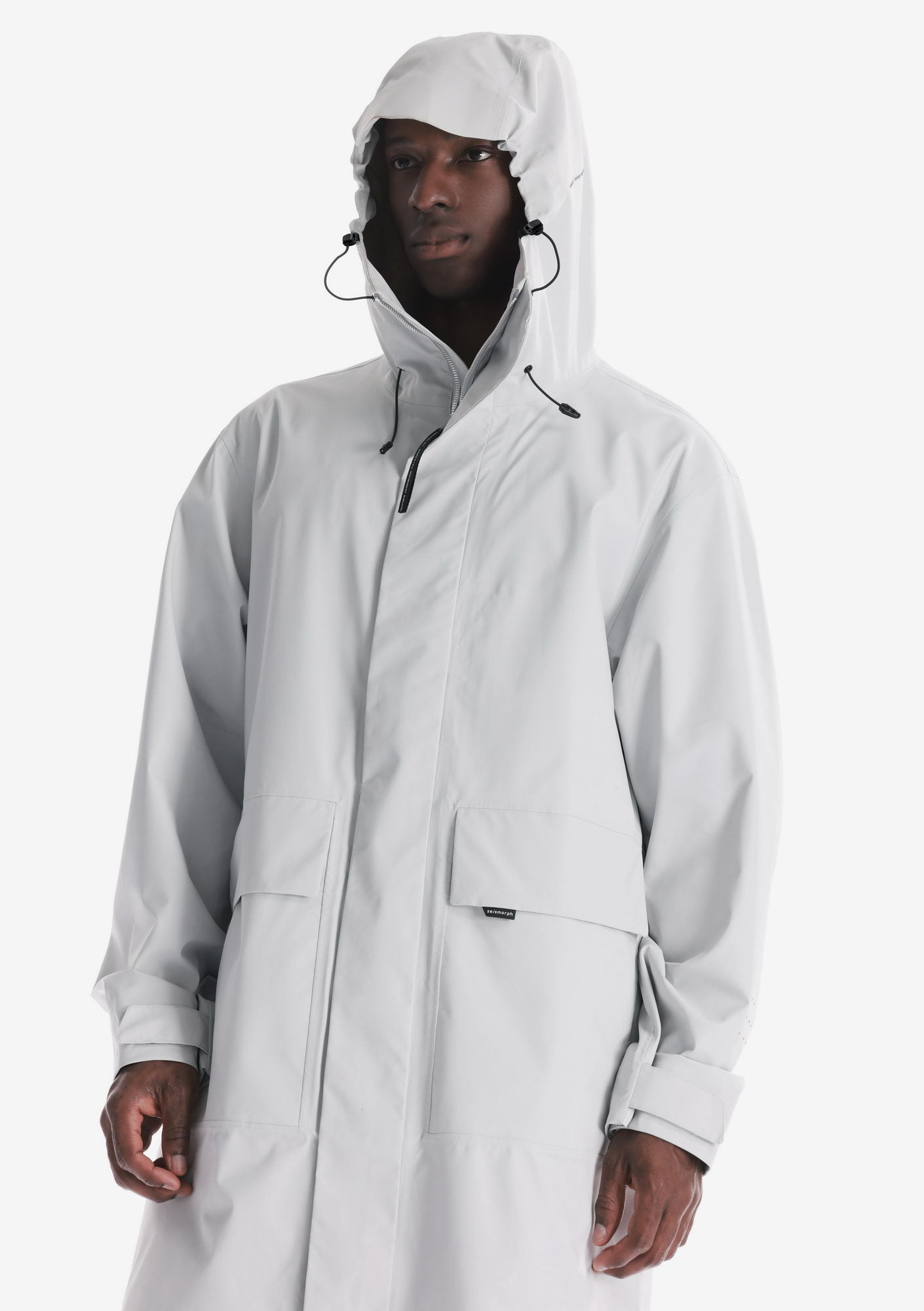 Technical raincoat SAGITTARIUS A features a modern relaxed fit and is made from functional water-resistant fabric with a cotton-like feel. The ergonomic hood and high collar provide protection from the elements. The windproof placket and magnetic pocket flaps fasten with a single effortless motion. Every detail of this raincoat is integrated into the form, enhancing its visual clarity.