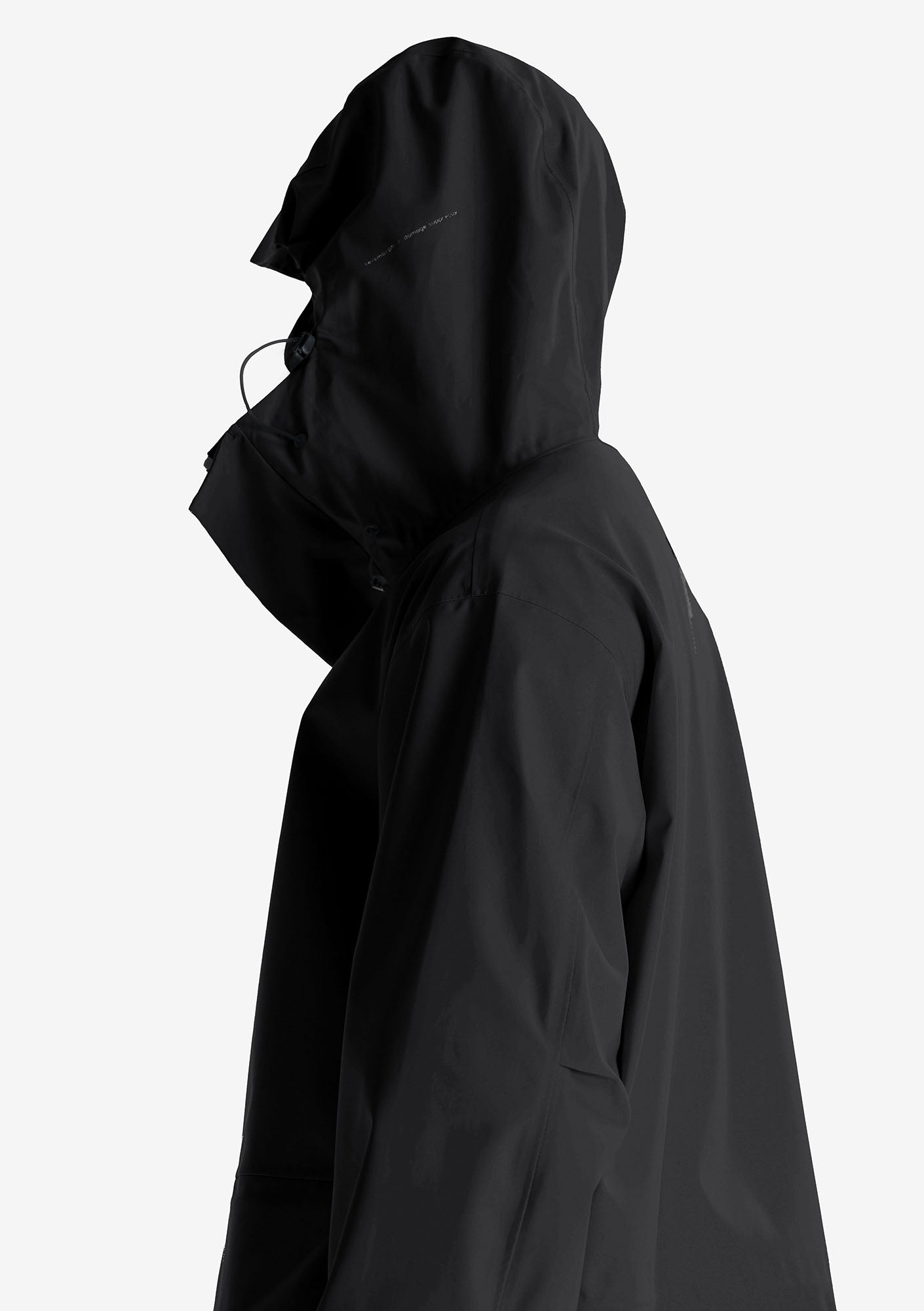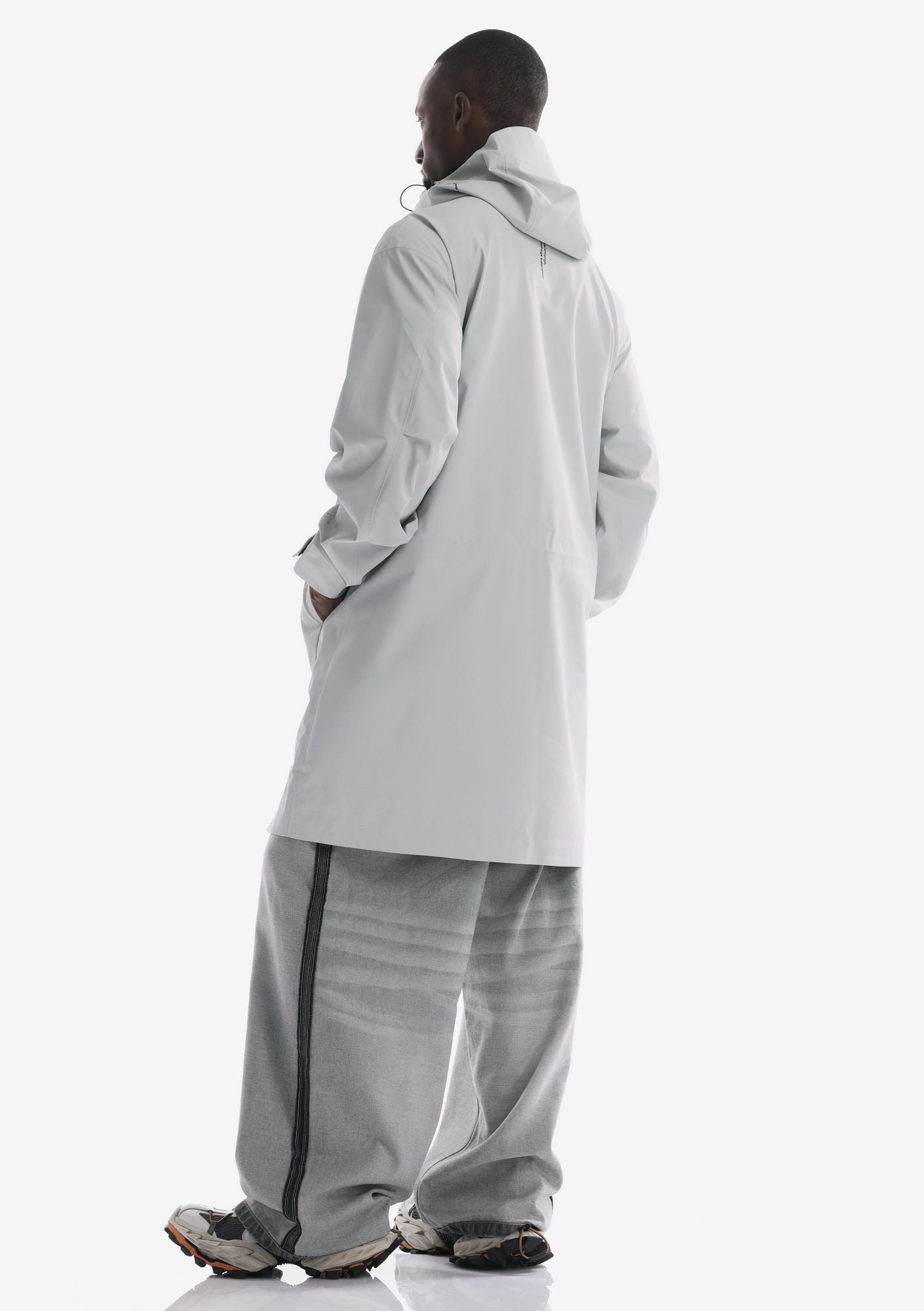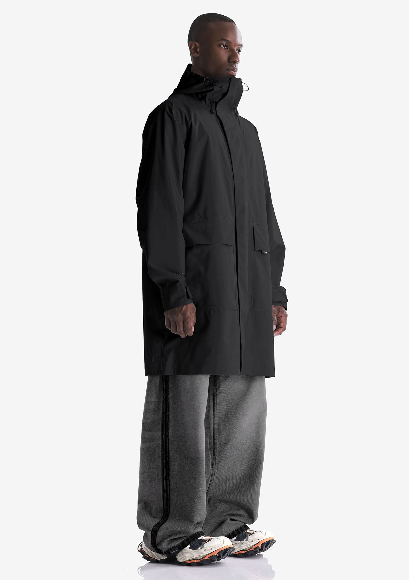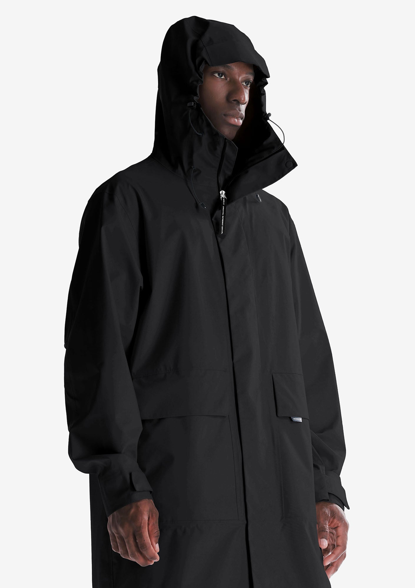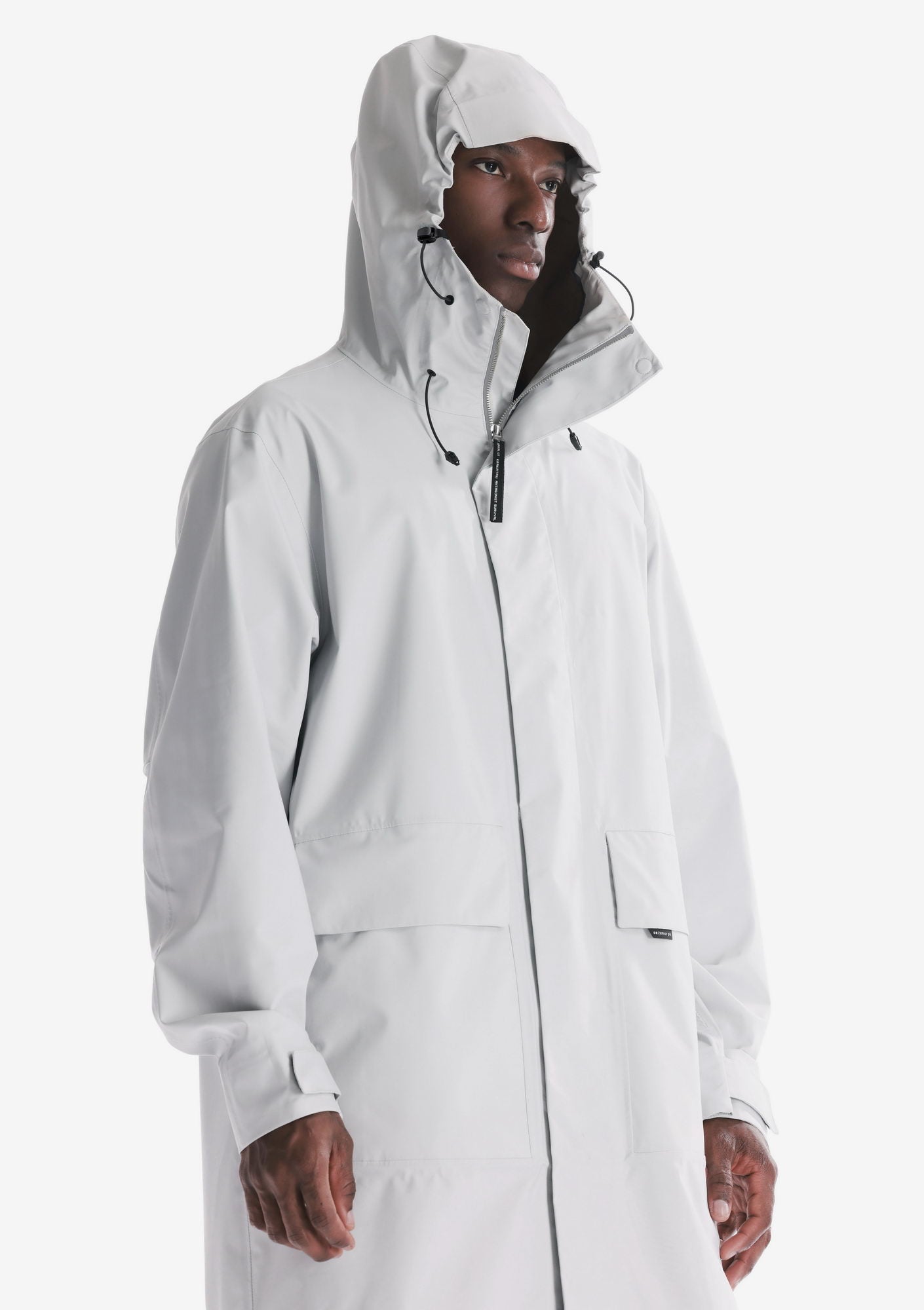 Technical raincoat SAGITTARIUS A features a modern relaxed fit and is made from functional water-resistant fabric with a cotton-like feel. The ergonomic hood and high collar provide protection from the elements. The windproof placket and magnetic pocket flaps fasten with a single effortless motion. Every detail of this raincoat is integrated into the form, enhancing its visual clarity.