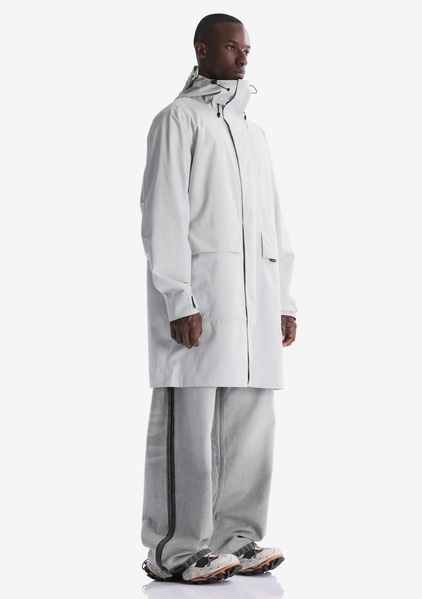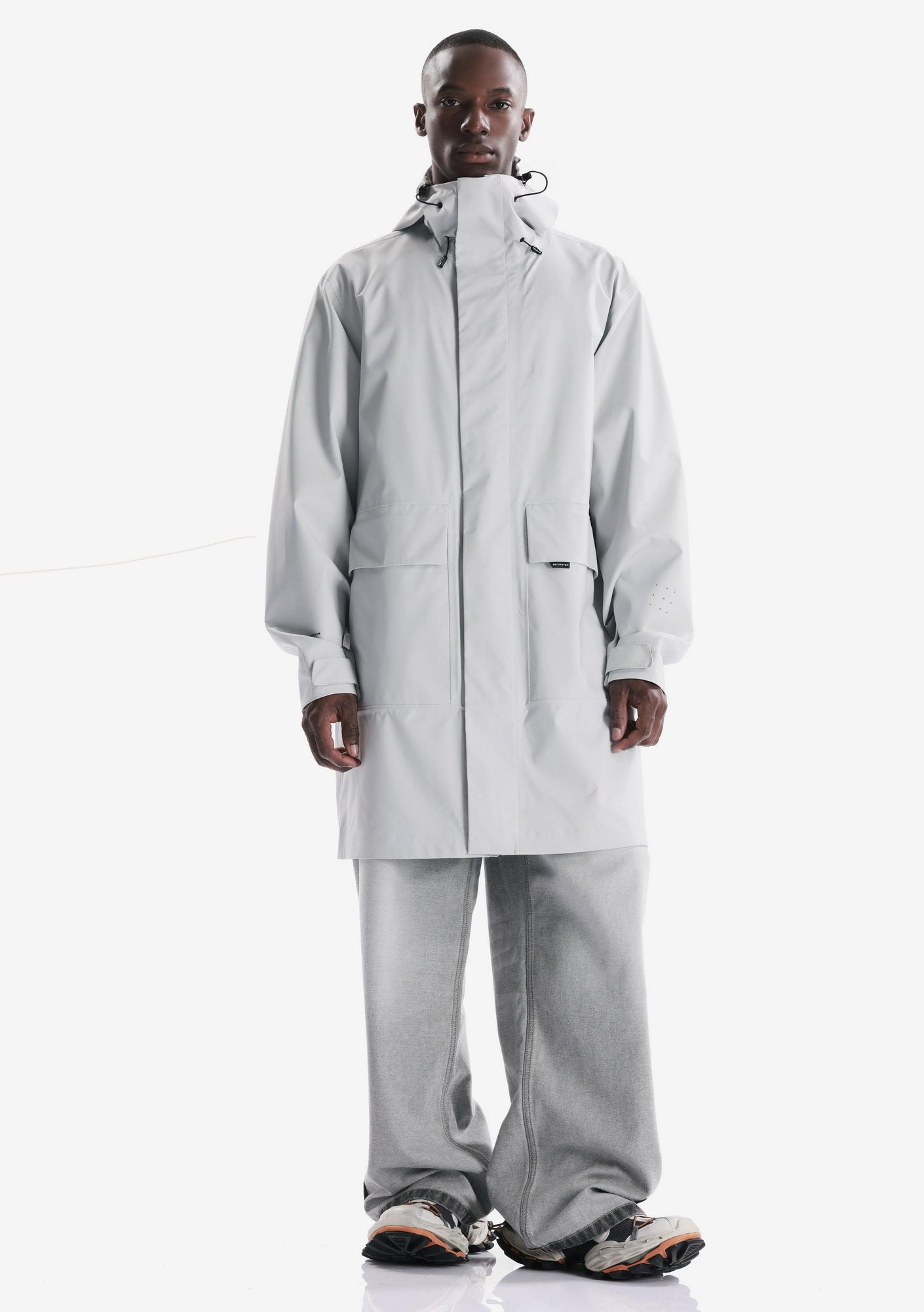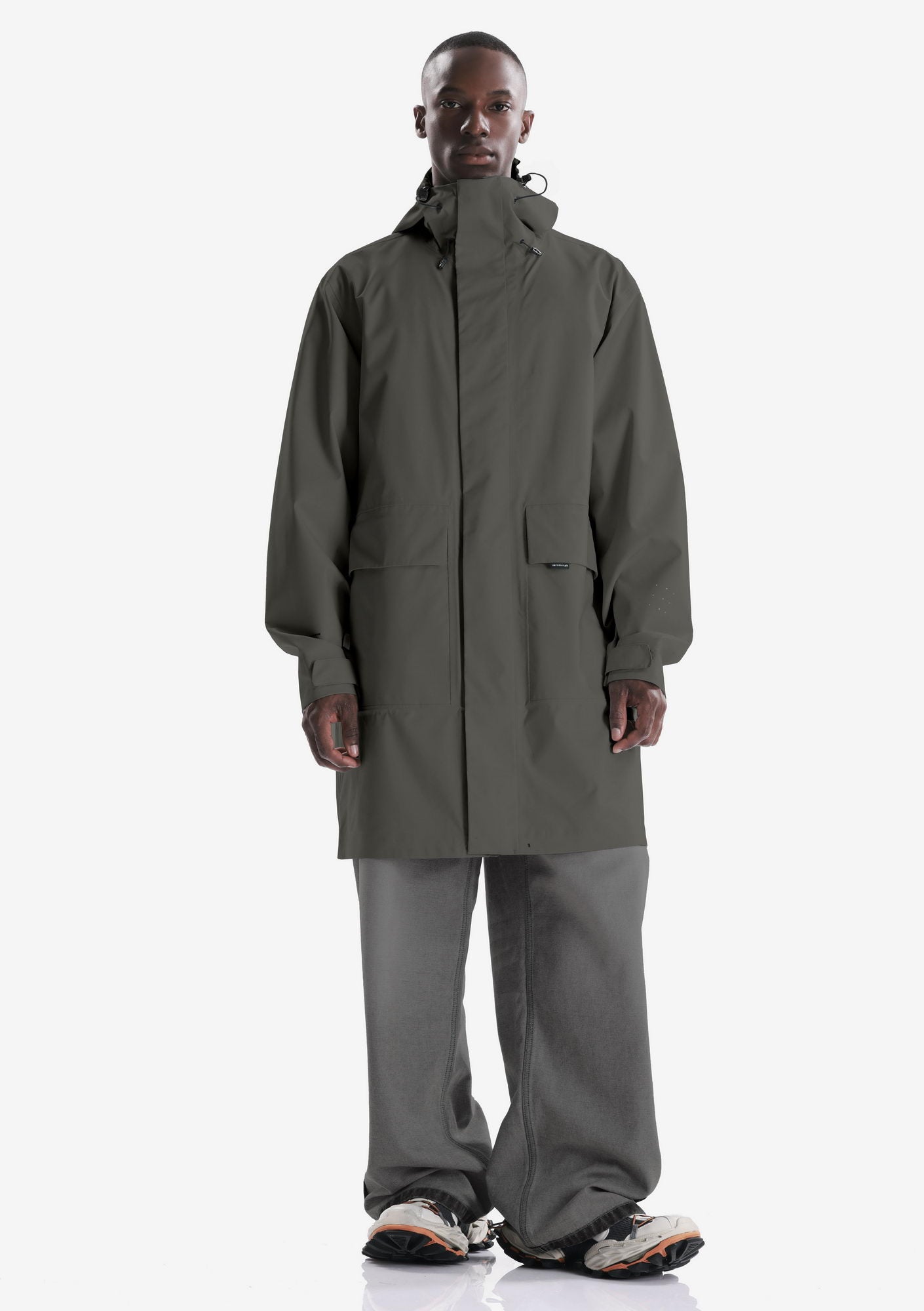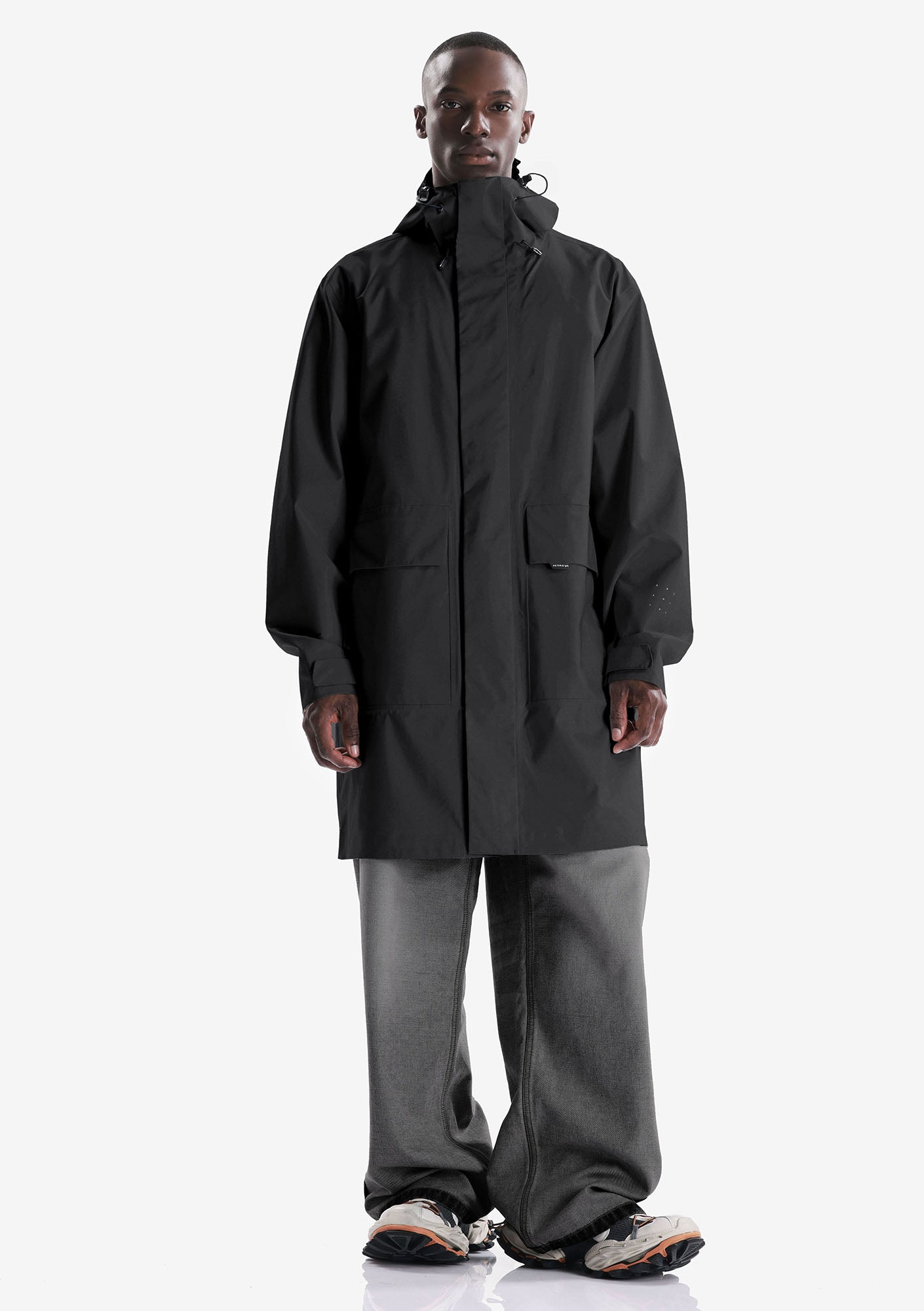 Technical raincoat SAGITTARIUS A features a modern relaxed fit and is made from functional water-resistant fabric with a cotton-like feel. The ergonomic hood and high collar provide protection from the elements. The windproof placket and magnetic pocket flaps fasten with a single effortless motion. Every detail of this raincoat is integrated into the form, enhancing its visual clarity.